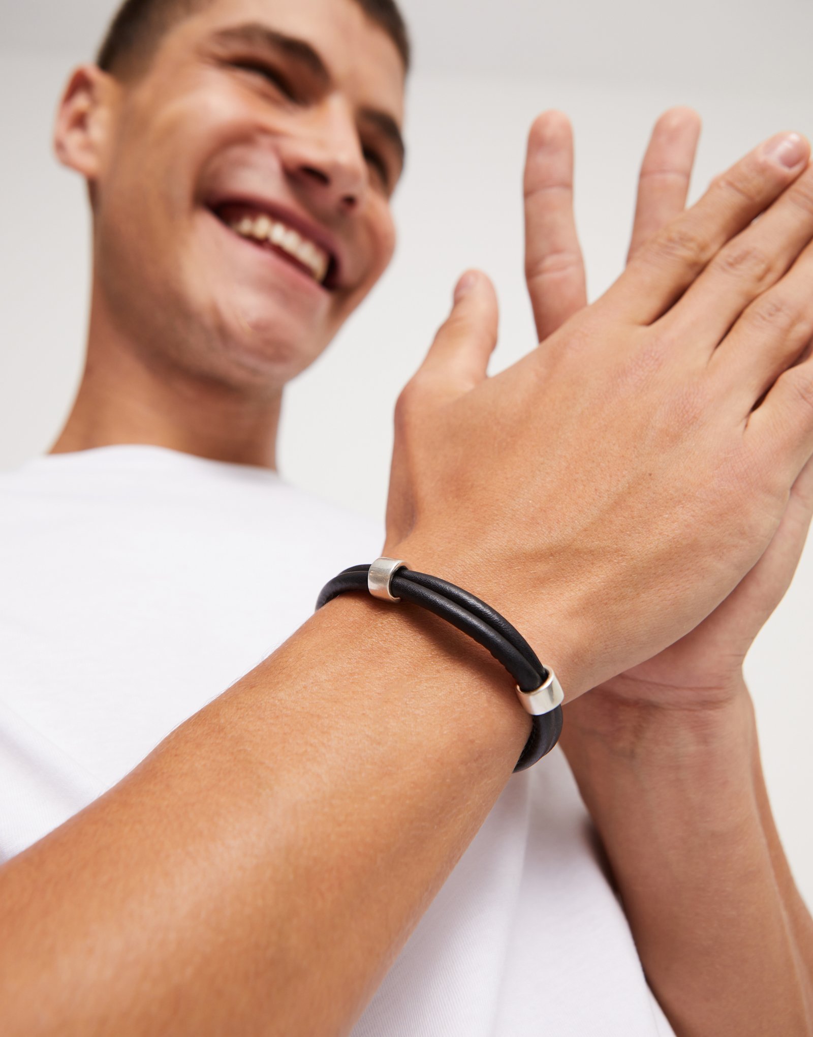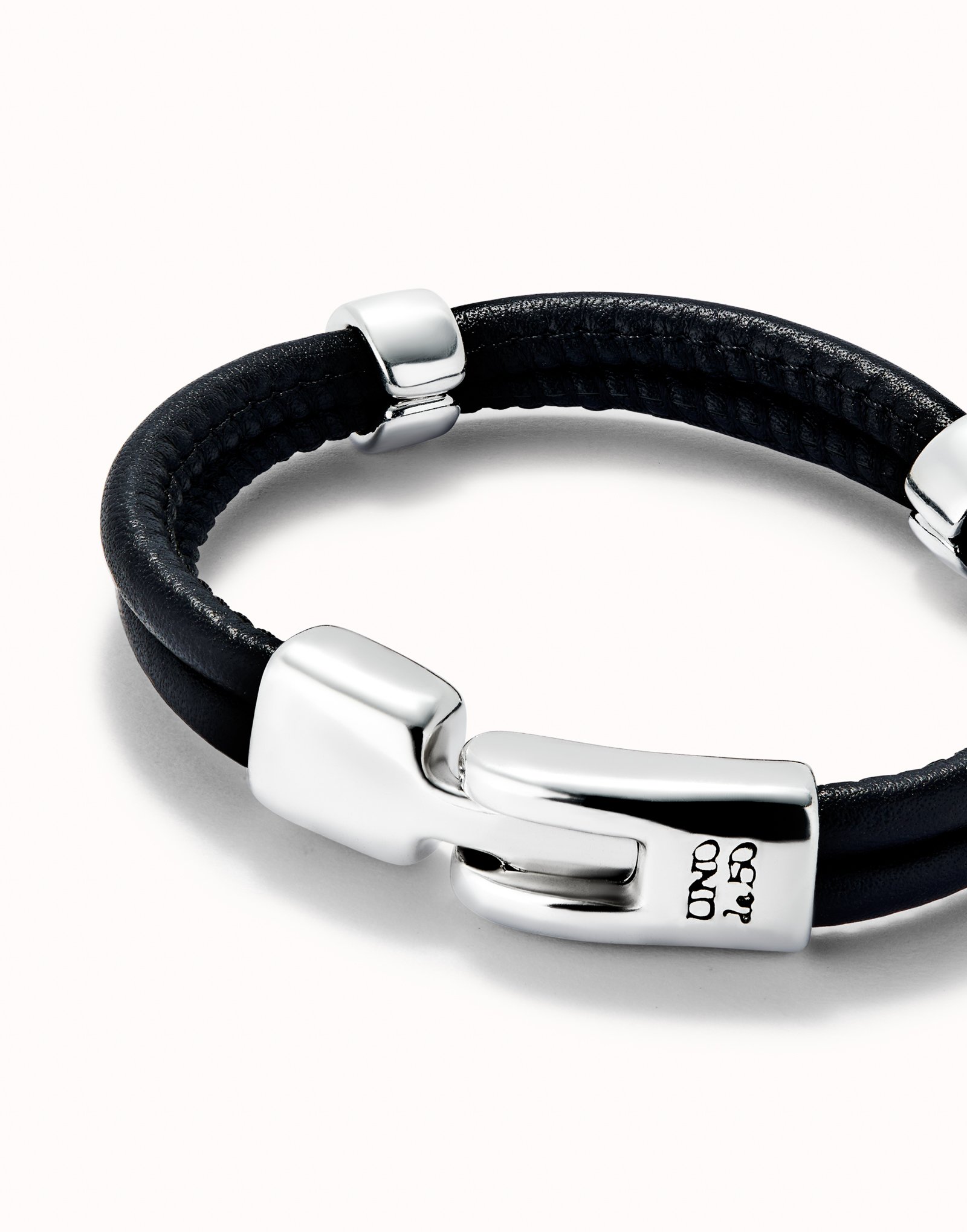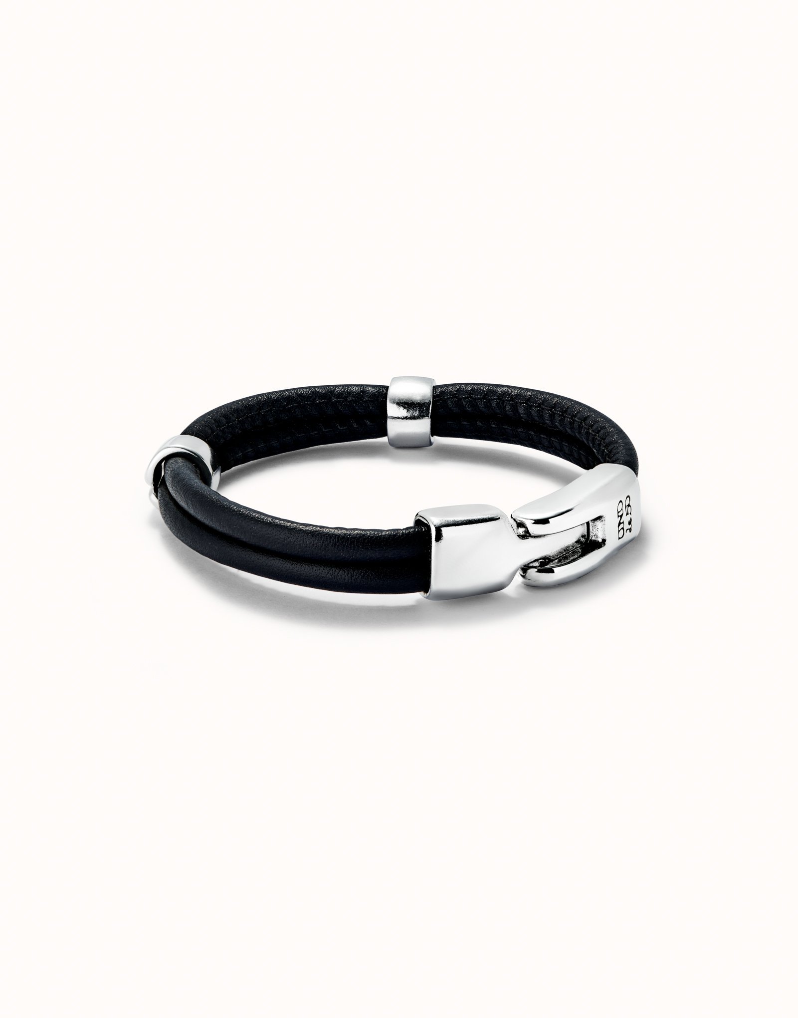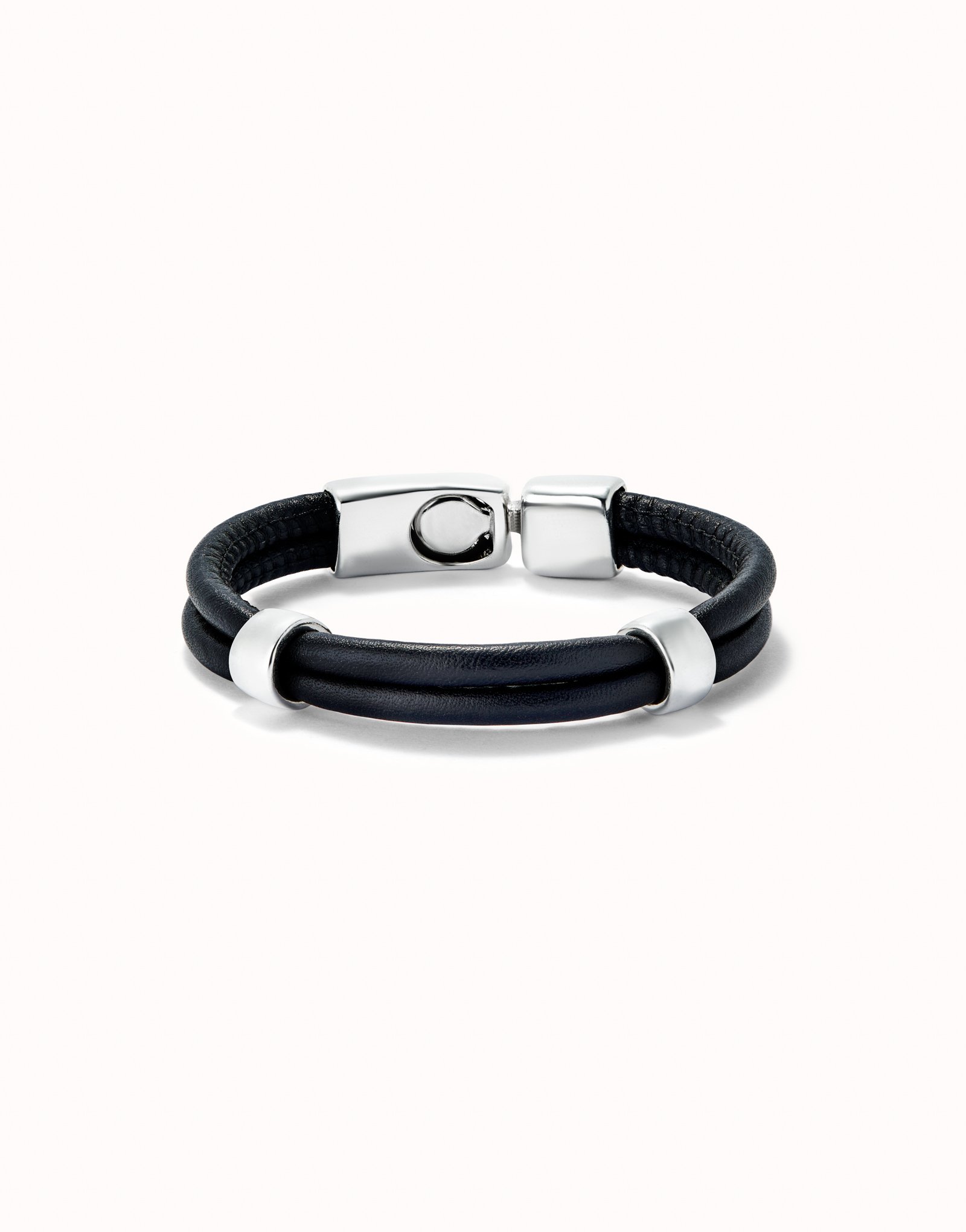 Pulseira dupla de couro com 2 círculos metálicos banhados a prata. Fabricada com um processo 100% artesanal. Coleção de jóias sem género que combina couro com Prata.