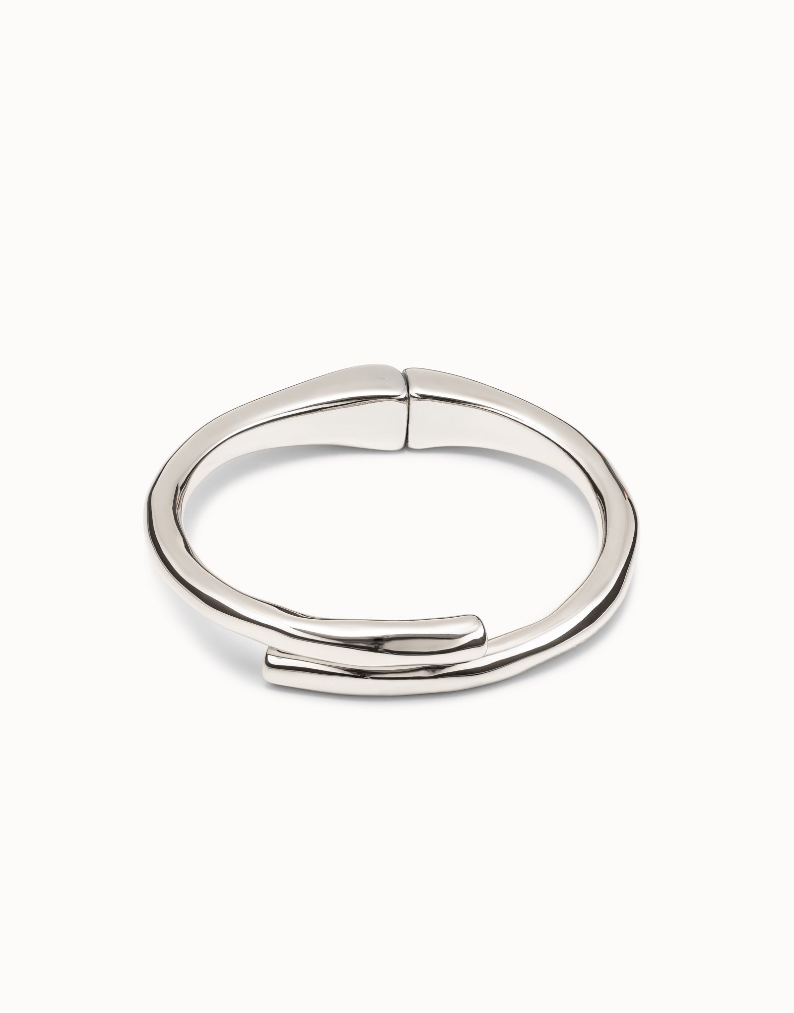 Pulseira de metal em forma tubular banhada a prata. Possui um mecanismo de mola central que permite abrir e fechar sem esforço. Esta peça é 100% fabricada à mão.