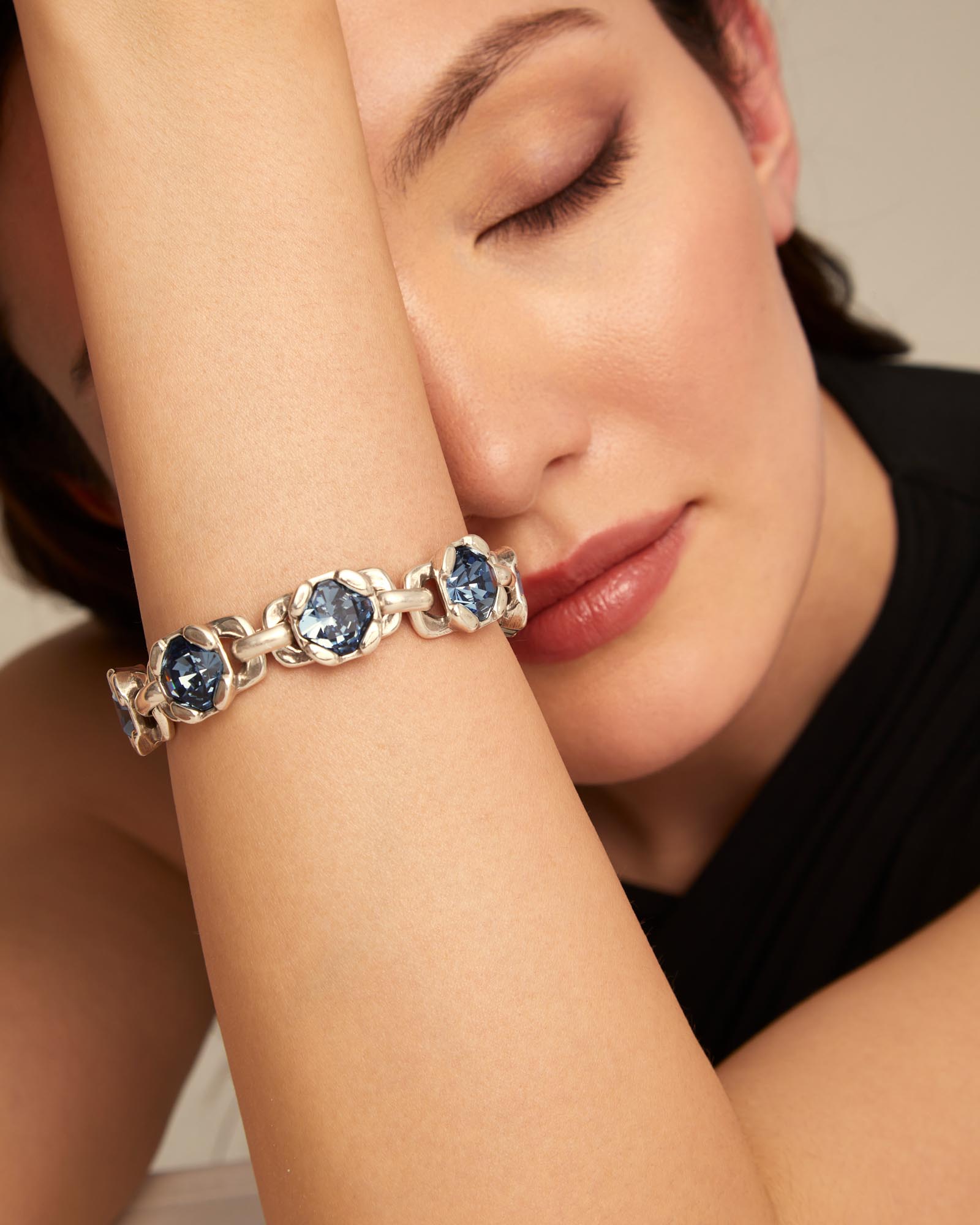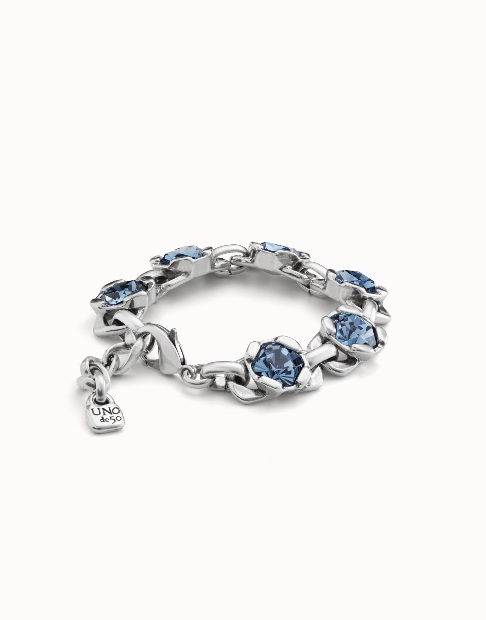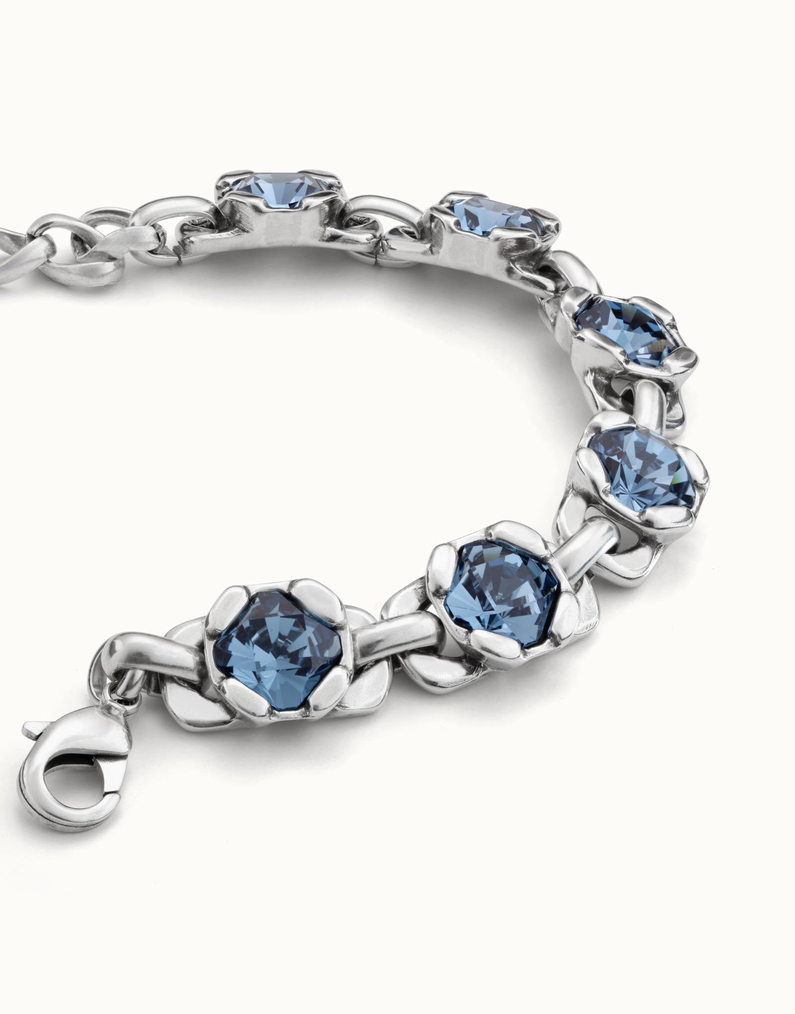 Pulseira de elos metálicos banhada a prata com sete cristais azuis facetados de forma hexagonal, fecho de mosquetão e uma corrente extensível que permite ajustar a peça ao tamanho desejado. Joia 100% artesanal, conseguindo um acabamento de design único.