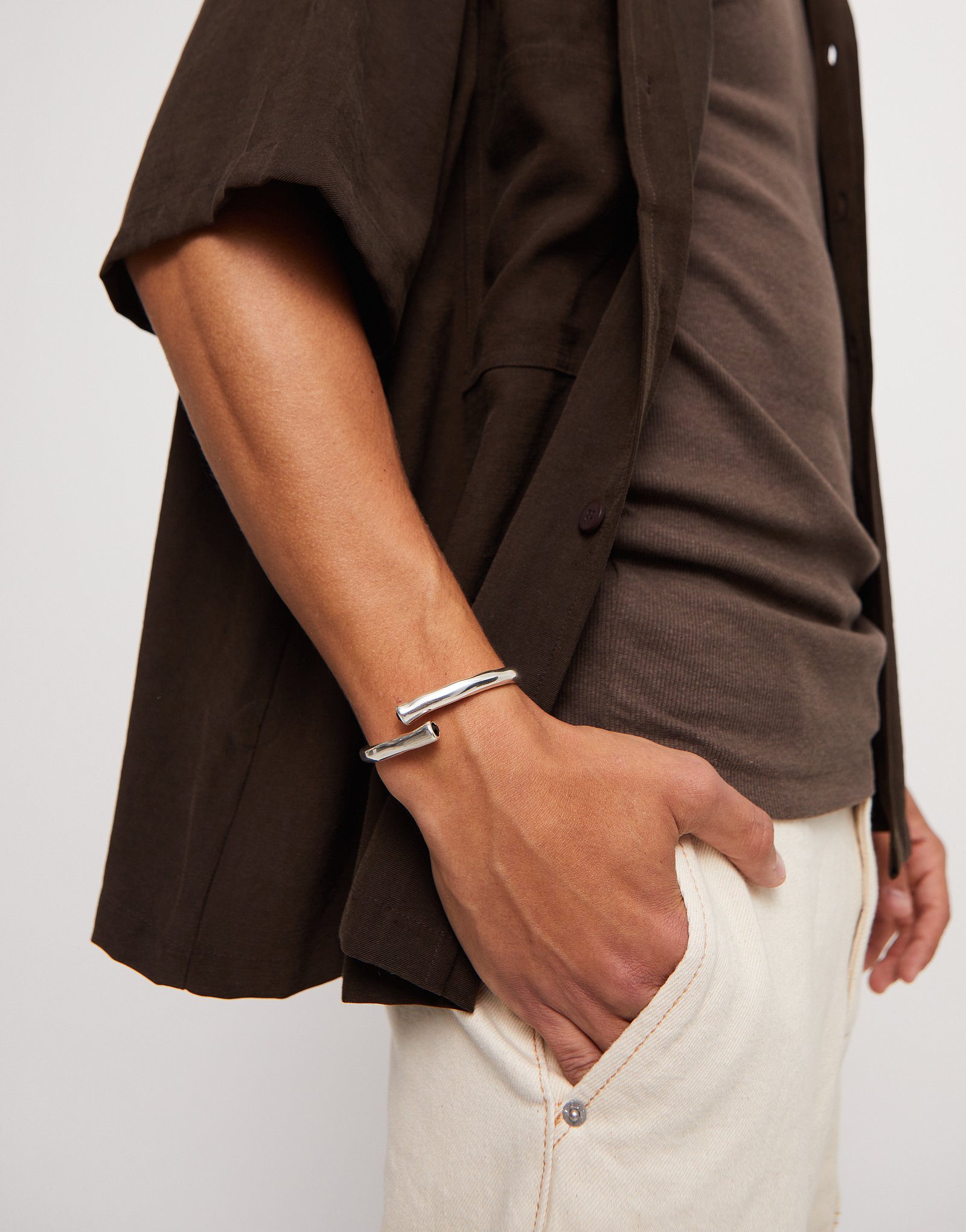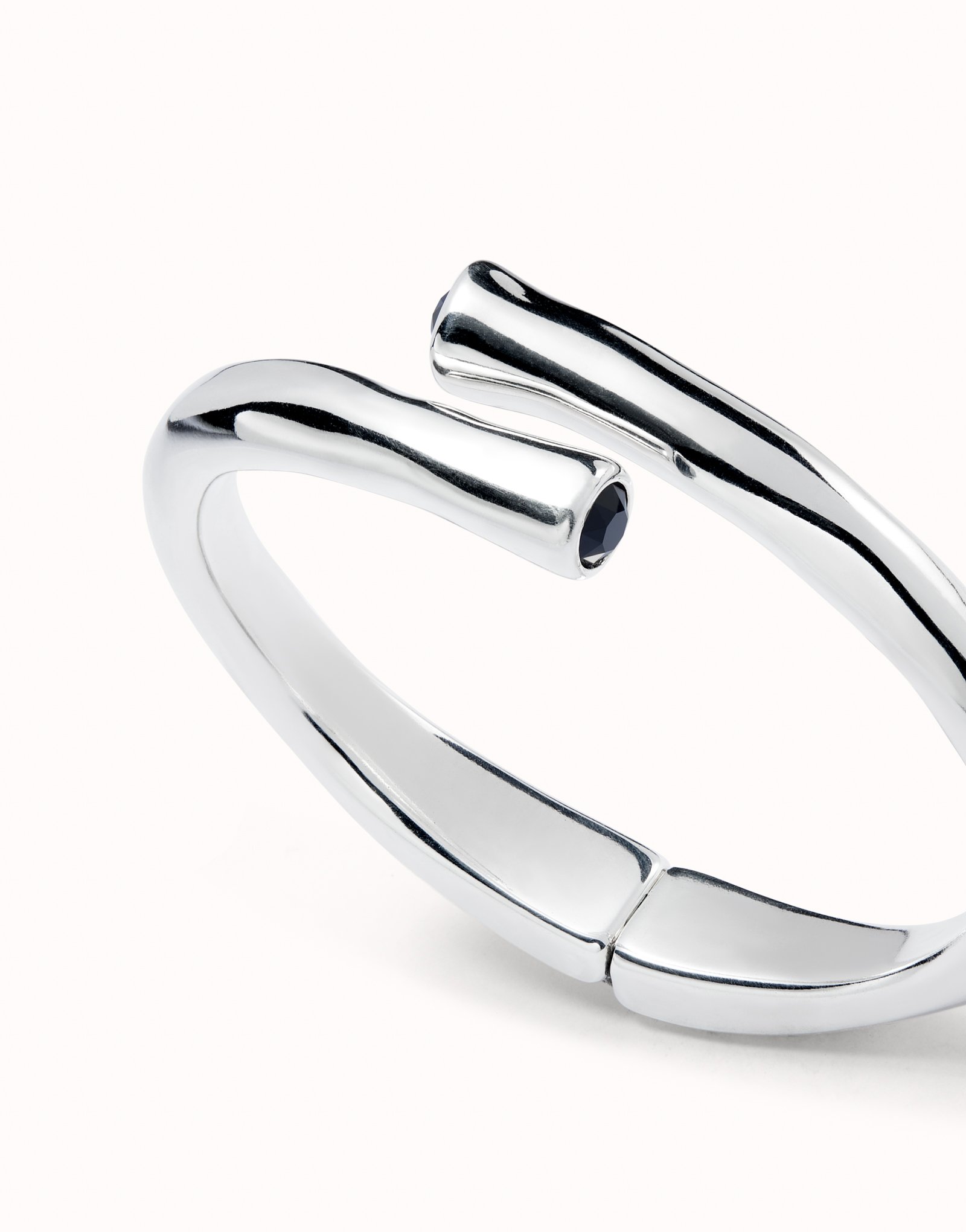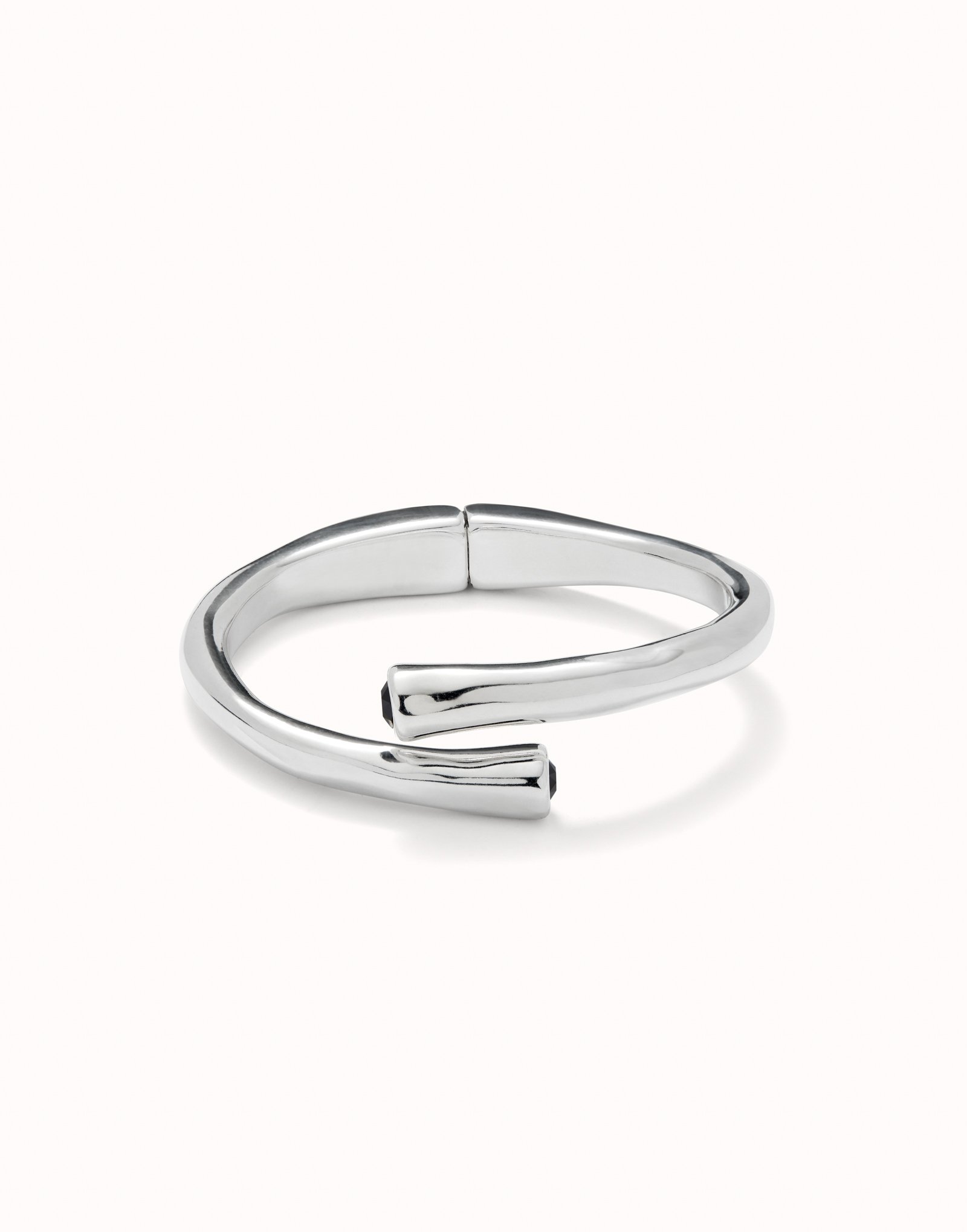 Pulseira rígida de metal banhada a prata com pormenor de cristais negros facetados nas extremidades. Fabricada com um processo 100% artesanal. Coleção de jóias sem género.